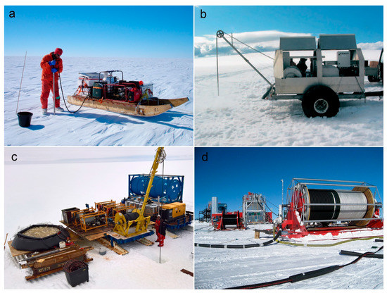 Examples of hot-water drilling systems: (a) BAS (British Antarctic Survey) lightweight hot-water drill for seismic survey, Pine Island Glacier, Antarctica, season 2006–2007 (Photo from personal communication: R. Stilwell, British Antarctic Survey); (b) shallow drilling with hot-water drilling system of Hydrological Service Division of the National Energy Authority, Iceland on the Langjökull ice cap, 2005 [5]; (c) overview of intermediate-deep AWI hot-water drill, Ekström ice shelf, Antarctica, January 2018; (d) hose reel and tower of IceCube deep hot-water drilling system, December 2008 (Photo from personal communication: J. Haugen from IceCube, 2008).