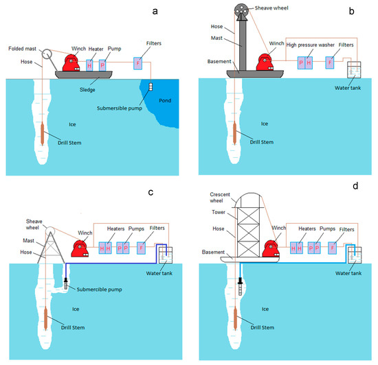 General schematics of typical hot-water drill systems depending on approaches to obtain water for drilling and to heat/pump water, as well as configurations for the mast and sheave wheel: (a) surface runoff water at mountain glaciers and the Greenland Ice Sheet that melt in the summer with folded mast, heater, and pump; (b) water melted in containers or tanks from surface snow and ice with dismountable mast and heater/pump unit combined in high-pressure washer; (c) water from supplementary borehole drilled nearby and connected with the main borehole by a subsurface cavity, stationary mast, and series of heaters/pumps; (d) water pumped out directly from the drilled borehole with tower, crescent wheel, and series of heaters/pumps.