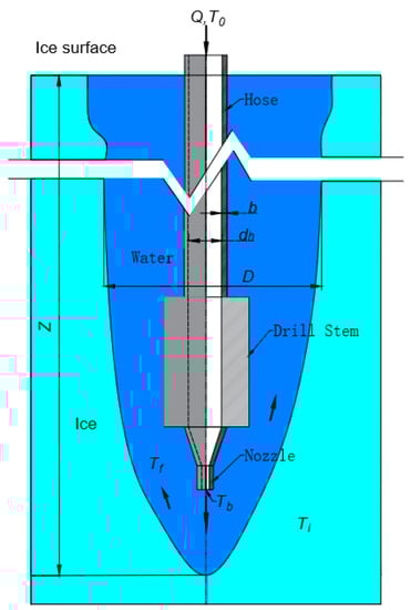 The heat from hot water spraying out of the nozzle (Figure 3) is used for (1) raising ice temperature to its melting point; (2) melting ice; and (3) mixing with melting water and raising the water temperature to a balance temperature. The energy balance at the bottom-hole area can be estimated as [5,15,17]: