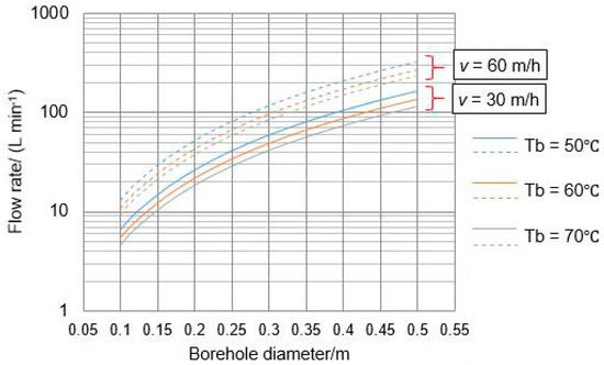 To drill holes with v = 30 m h−1 (that could be considered as the minimal desired ROP) and mean diameter ≥0.3 m, the minimum flow rate should be ≥60 L min−1, assuming that the temperature of the sprayed hot water at the bottom of the hole Tb ≥ 50 °C (Figure 4). The ROP is directly proportional to the flow rate of hot water (Figure 5). To drill as fast as possible, one needs to follow the simple rule: higher flow rate and higher temperature lead to a higher ROP. Both parameters are limited by the capacities of the commercially available or customized equipment planned to be used in the system. Considering that the borehole is usually not round and that the energy efficiency at the melting region cannot achieve 100%, we suggest to choose a rate 1.2–1.5 times higher than the minimum flow rate as the final choice.