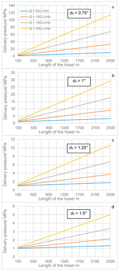 Required delivery pressure of hot water flow vs. length of the hose at different hose diameters (a, 0.75″; b, 1″; c, 1.25″; d, 1.5″) and flow rates; local pressure losses are taken as 1 MPa.