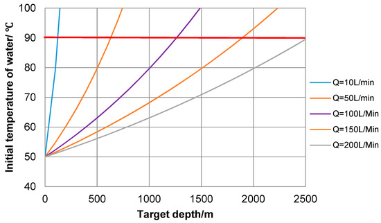 In the general case, the initial temperature of the water increases with Tb, k, dh, and z, and decreases with an increase in Cw, Q, and b. Figure 7 shows the required initial water temperature depending on target depth, assuming Tb = 50 °C, b = 11 mm, dh = 38 mm, k = 0.3 J s−1 m−1 K−1, and Cw = 4190 J kg−1 K−1. The hot water supply temperature can reach as high as 80 to 100 °C depending on the drill site elevation and boiler capacity. Assuming the maximal initial temperature of hot water as 90 °C, using pumps with a rated flow rate of 50 L min−1 has a target depth limitation of 600 m, 100 L min−1–1200 m, and 150 L min−1–1900 m. If the target depth is 2000 m, the initial temperature must be at least 80 °C at a 200 L min−1 flow rate.