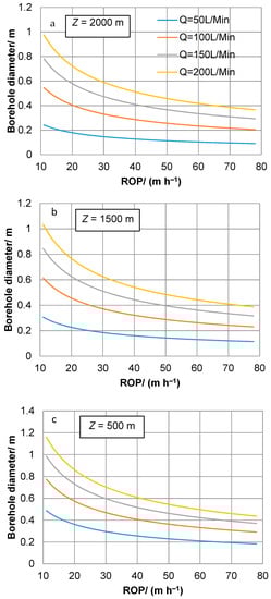 Mean borehole diameter vs. ROP at different target depths (a, 2000 m; b, 1500 m; c, 500 m) and flow rates (b = 11 mm, dh = 38 mm, k = 0.3 J s−1 m−1 K−1, Ti = −20 °C, and Cw = 4190 J kg−1 K−1)