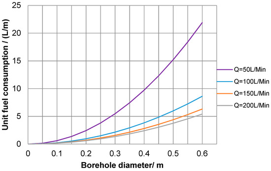 Fuel consumption (diesel) vs. mean borehole diameter at different target depths and flow rates (b = 11 mm, dh = 38 mm, k = 0.3 J s−1 m−1 K−1, Ti = −20 °C, and Cw = 4190 J kg−1 K−1)