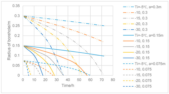 Figure 10 shows borehole closure in different surrounding temperatures and different initial borehole radii, and if the radius of the borehole is 0.3 m, the borehole would close to 0.15 m after 24 h if the surrounding temperature of the ice is −30 °C, while it will be closed to 0.284 m after 24 h if the temperature is −5 °C. If the time of the hole to be open with the minimal diameter is not enough to finish drilling and observations, then reaming must be included in the working procedure.