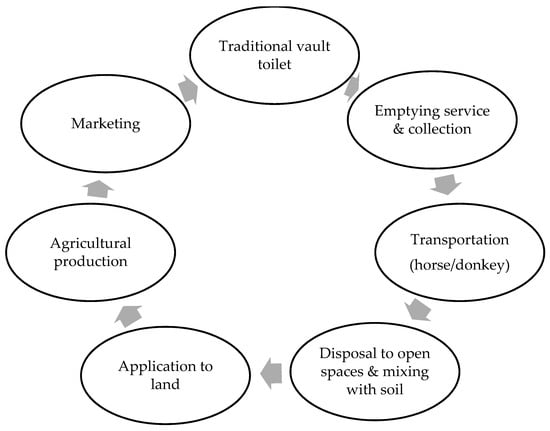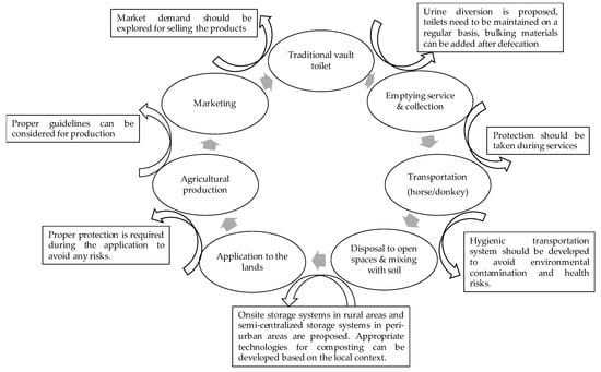 An integrated strategy is necessary to improve T-CLSS in both rural and peri-urban areas. Each component of T-CLSS (Figure 4) must be improved for resource/nutrient recovery, and in terms of environment and health protection, to reduce risks and threats associated with existing T-CLSS.