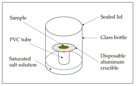 The FS samples were manually homogenized using a stainless-steel spatula. One drop of thymol was brushed onto the bottom of each aluminum crucible to prevent mold growth. Then, the samples were placed and weighed in the aluminum crucibles. Samples were spread to have approximately the same circular shape with a radius of 0.5 or 1 cm for the 1.5 g and 5.0 g samples, respectively. Each crucible was then placed on a PVC tube fixed to an airtight Mason jar with a saturated salt solution to control the relative humidity (Figure 1). These Mason jar desiccators were incubated at 35 ± 1 °C. Samples were weighed at regular intervals (24 h) until their mass varied by less than 2% W/W, the adopted operational threshold for equilibrium moisture content determination (approximately two weeks). It was ensured to limit the opening time of the jars to avoid humidity loss or gain. Finally, the equilibrium water content was calculated from the dry mass providing a point of the isotherm of sorption when coupled with RH values.