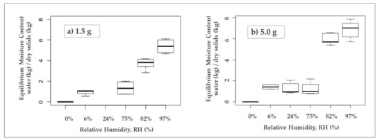 Box and whisker plots (min/max, lower/upper quartiles, and median) of equilibrium moisture content data for each given relative humidity at a temperature of 35 °C and an initial FS sample with masses of (a) 1.5 g and (b) 5.0 g.