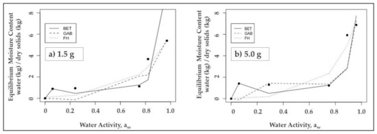 Figure 3 depicts experimental data fit with Brunauer–Emmett–Teller (BET), Guggenheim–Anderson–de Boer (GAB), and Flory–Huggins (FH) models at 35 °C and for both 1.5 g and 5.0 g initial sample masses. Table 3 summarizes the parameter estimates, standard error, and the residual standard error (RSE) to determine the best data fit for the model. The FH model was rejected for both sample masses, and the BET model was rejected for the 1.5 g sample mass, since model parameters (i.e., constant) failed the Student’s test for significance (p-Value < 0.05). The GAB and BET models are both valid for the 5.0 g sample mass since the equation parameters (C, M0, K’) were satisfactory (Pr (>|t|) = 0 to 0.05). For BET, M0 is associated with the moisture content (dry basis) corresponding to an adsorbed monolayer (BET) and C and K’ are constants related to the temperature effect. Further testing should be performed across the range of humidity values to improve the calibration of the models and provide better assessment of the most suitable one for FS.
