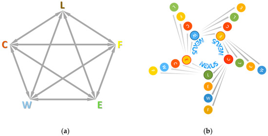 Water, energy, food, land use and climate, the five nexus components as defined in [7] are linked to one another, through numerous direct or indirect interrelations (Figure 1a). A direct interconnection between two variables (e.g., land use and water) is defined as the effect in a variable’s status (e.g., water), generated by a change in the other variable’s status (e.g., land use), assuming that all other components (e.g., food, energy, or climate) remained unchangeable and did not affect the state of the two variables. Indicatively, for the aforementioned example, a change in land use (ΔL), such as a shift into agricultural land, will cause a shift in water (ΔW), by increasing agricultural water demand. This is one of multiple direct paths through which a shift in land use would cause a shift in water. The sum of the direct pathways of ΔL to ΔW is referred to as the land–water direct interlinkage and is denoted as L→W, or simpler as LW; it comprises all the ways that a change in land use is expected to affect water (including water quantity, quality, location, etc.). It should be noted that, for the basis of this research, each direct pathway is unique and the opposite direction interlinkage is a different one; thus, LW is not the same to WL. The second refers to the effect that a shift in water can cause in land use, for example desertification caused by water scarcity, which is totally different. Respective to these definitions, the unique direct interlinkages of the nexus components are twenty in total. Those twenty interconnections are illustrated in Figure 1b and listed below: