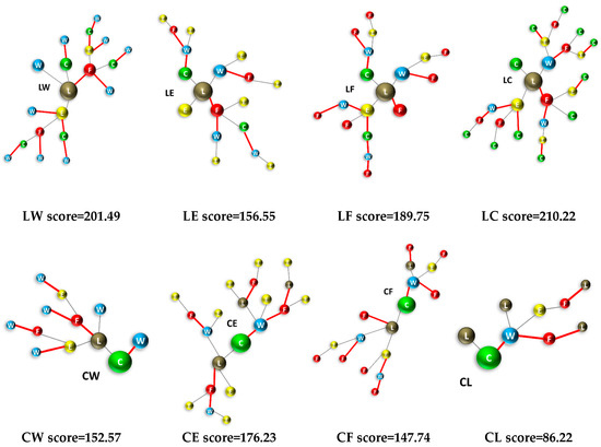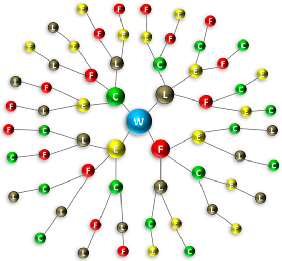 For drawing and counting the multiple different interlinked pathways of all orders, the nexus tree was designed for one nexus dimension at the time (the water nexus tree is showcased as an example in Figure 2, showing all possible direct and indirect interlinkages of water). The nexus tree is a graphic representation of all alternative paths that lead to various changes generated by a single shift in one of the nexus elements. An initial virtual shift in the central nexus component (water in this example) caused corresponding shifts in the rest of the components through the nexus tree branches. In particular, for the water nexus tree depicted in Figure 2, firstly the four first-order interlinkages (WC, WE, WF and WL) were drawn as branches, showing how a single shift in water affected all the other dimensions. Drawing the second-order interlinkages, three branches were generated out of each one of the four nexus variables (C, E, F, and L), since the interconnection with water was already drawn (first-order connection). Therefore, from climate we get CE, CF, and CL; from energy we get EC, EF, and EL; from food we get FC FE, and FL and from land use we get LC, LE, and LF. Moving out to the third level, we get two branches out of each nexus variable, and finally at the fourth level, a single branch formed out of each nexus variable. This way, it was ensured that each path, when followed from the route to the end as it branched out, was not repeating a nexus component but had a unique sequence of the five nexus variables. Twenty-four unique sequences in total are depicted in the nexus tree of Figure 2, which shows water at the center; these are the following: WCLFE, WCELF, WCFLE, WCFEL, WCLEF, WELFC, WCEFL, WECLF, WEFLC, WEFCL, WELCF, WFLEC, WECFL, WFCLE, WFELC, WFECL, WFLCE, WLFEC, WFCEL, WLCFE, WLEFC, WLECF, WLFCE, WLCEF. Equivalent trees can be designed for the rest of the nexus components at their centers, giving a total number of 24 × 5 = 120 unique fourth-order sequences for the whole nexus web.