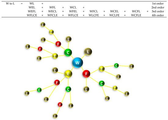 Following this framework, one can define all pathways that can lead to a change in one nexus component because of a change in another. In this article, we present, with the following example, how a shift in water can affect land use, using the nexus tree: We firstly create all first-, second-, third-, and fourth-order links with water as a starting nexus component and land use as the final. This is depicted in Figure 3, in which the nexus tree depicted in Figure 2 is repeated, having erased all branches or branch parts that terminate in land use. This results to a sum of 16 paths: WL, WEL, WFL, WCL, WEFL, WECL, WFEL, WFCL, WCEL, WCFL, WEFCL, WECFL, WFECL, WFCEL, WCEFL, and WCFEL and includes all direct and indirect pathways though which a shift in water can cause a shift in land use. Following the schematic simulation approach presented above, all paths can actually be assessed. Therefore, the total influence that a shift in water will have on land use will be the conceptual sum of all direct and indirect interlinkages, as depicted below. Naturally, most high-order interlinkages may turn out to not be significant and may eventually drop out, allowing for the most important ones to shape up the total influence that water has on land use. A Table that lists all pathways for all nexus variables following the nexus tree approach is included in the Appendix in [7].
