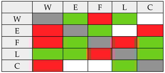 Schematic representation of interlinkages among all five nexus components. Green represents a “weak” interlinkage, red represents a “strong” interlinkage and white stands for “negligible” interlinkages. Influencing nexus components are shown in the columns and influenced nexus components are shown in the rows. W = Water; E = Energy; F = Food; L = Land Use; C = Climate.