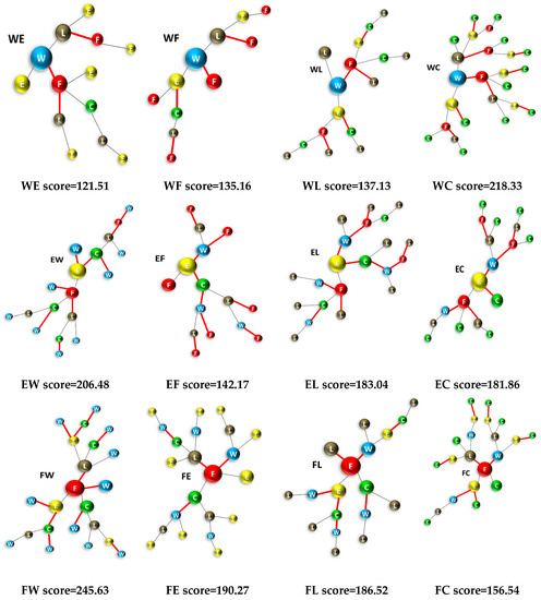 The nexus tree approach constitutes a method for depicting the chain of interlinkages and can be a useful tool for modelers as a step-by-step approach to take into account all interlinkages, direct and indirect, so that no indirect relationship is left out, when considering the whole convoluted tree of effects. Nexus trees are shown in Figure 5 for all 20 interlinkages that link all nexus elements with one another, for the case of Greece. These nexus trees start from the initial structure, which is analogous to the one shown in Figure 3 for WL, and take into account the scoring system shown in Table 1: When an interlinkage is “strong”, it is shown as a red line; when it is weak, it is shown as a black line and when it is “negligible”, the whole branch is eliminated. We see that some trees are simpler than others; e.g., CL is a simple tree with relatively few nodes and paths, while WC and FW are quite complex with multiple nodes, links and interactions. The heuristic is applied to all trees, considering first-, second-, third- and fourth-order interlinkages; trees are worked from the central node outwards and scores of indirect (higher-order) interlinkages are obtained, thus quantifying the intensity of their relationship. The interlinkage scores obtained from the application of the heuristic for all twenty interlinkages are shown underneath each tree and are included in a cross-interlinkage matrix in Figure 6. It should be noted that interlinkage scores should only be seen qualitatively and in comparative terms, i.e., in order to compare the relative influence among nexus components. Besides, the values have no physical meaning.
