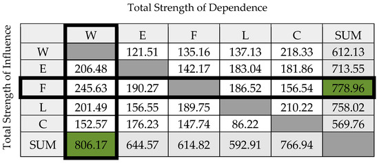 Cross-interlinkage matrix of five nexus components and their interactions for Greece. The total strength of interlinkage from a nexus component on all other nexus components is shown by the row-sum and the column-sum shows how much a nexus component is influenced by all other nexus components in total. Highest row- and column-sums are marked in green. W = Water; E = Energy; F = Food; L = Land Use; C = Climate.