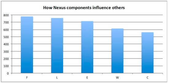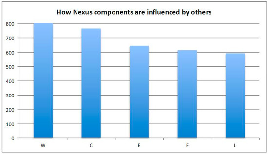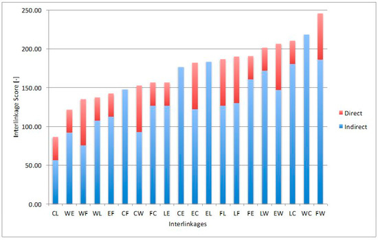 The information included in the cross-interlinkage matrix is also depicted in Figure 7 and Figure 8, where nexus elements are listed separately in ranking order, depending on whether they influence other nexus elements (Figure 7) or are influenced by nexus elements (Figure 8). Interlinkage scores obtained from the application of the heuristic for all 20 interlinkages are also shown in the chart of Figure 9, in which both direct (first-order) and indirect (higher-order) interlinkage scores are shown. We see that the strongest total interlinkage is the one of food to water (FW), while the highest indirect interlinkage score is that of Water to Climate (WC). In fact, the water to climate (WC) pair has the second highest total interlinkage score, signifying that the impact of water on climate is strong, even though the direct relationship is classified as “negligible” according to Table 1. This is supported by the fact that the WC nexus tree (Figure 5) is complex with many nodes and high-order paths, which results in the high indirect score. The results in Figure 8 provide evidence that the nexus tree heuristic algorithm is important and reveals the fact that indirect interlinkages may play a prominent role in the overall interlinkage strength and should not be either ignored or underestimated. A nexus analysis that does not acknowledge the significance of indirect interlinkages and only focuses on direct relationships will lead to erroneous results. Most nexus analyses, however, would only focus on direct interlinkages, completely by-passing the effect of a series of indirect relationships that can, after all, play an important role.