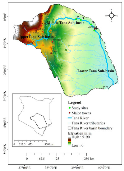 The present study is about a tropical river, the Tana River, which is also the longest river in Kenya (Figure 1). The Tana River basin lies approximately between latitude 0°0′53″ and 2°0′41″ S, and longitude 38°25′43″ and 40°15′00″ E, and covers a catchment area of about 126,000 km2. The river traverses across various physiographical and climatic conditions in the basin, which is roughly divided into Upper, Middle and Lower Tana sub-basins. The Upper, Middle and Lower Tana sub-basins cover an area of 15,000, 15,700 and 95,300 km2, respectively, and corresponding elevations of 1000 m, 300–1000 m and below 300 m [29]. The Tana River Basin is characterised by different landscapes including forests, mountain vegetation, agro-systems, arid and semiarid lands, freshwaters and wetlands, marine, and coastal areas that are highly susceptible to inter-annual variability in river flow and climate change [30,31].