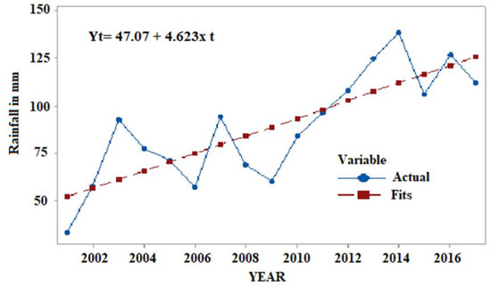 Trend of mean annual rainfall in the upper Tana Basin upstream of Garissa river gauging station between 2000 and 2016.