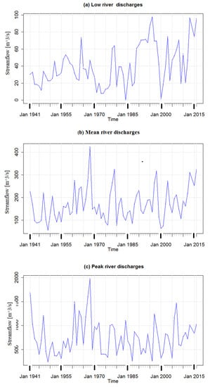Figure 3 illustrates the daily discharge time series (Figure 3a) and monthly streamflow distribution (Figure 3b) for the Tana River records at Garissa gauging station. Peak flows occur during long rainfall (April–June) and short rainfall (November–December) periods. In the 17-year period, a statistical analysis of the streamflow datasets indicated statistically significant trend and seasonal variability. The rainfall in the basin exhibits two precipitation cycles which result in two peak discharges and potential flooding frequencies. A high long discharge happens between April and June, which coincides with the long rainy season, and a short high streamflow period happens during the short wet season between the months of November and December as shown in Figure 3b. Flood flows generally range between 200–700 m3 s−1 while mean flow is 178.5 m3 s−1. Infrequently, extreme flood events with streamflows over 1000 m3 s−1 can be seen. Figure 4 gives the extremal annual values of low streamflows, mean or moderate streamflows, and maximum streamflows (peak flows) over the period. Peak river flood flows of about 1500 m3 s−1 and above were recorded in 2007 (Figure 4c). A trend analysis by non-parametric Mann–Kendall test [53] shows tau = 0.36, 2-sided p-value = 0.0583 for peak flows, tau = 0.483, 2-sided p-value = 0.010 for mean stream discharges and tau = 0.471, 2-sided p-value = 0.013 for low streamflow over the period at 95% significance level. Over the period, all the extremal flow data exhibited significant increasing trend.