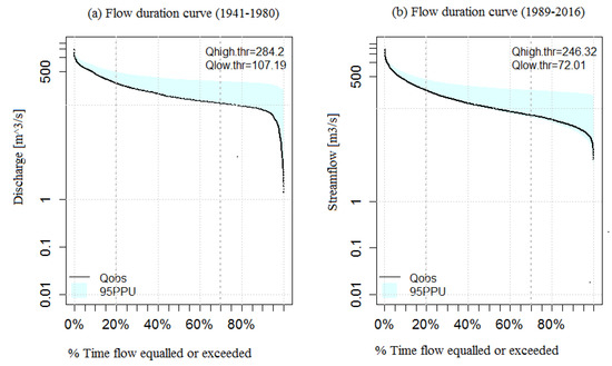 Flow Duration Curve of Tana River, comparing 1941–1980 and 1989–2016 periods showing observed streamflows (Qobs) for two uncertainty bounds (95PPU being upper bound at 95% confidence level).