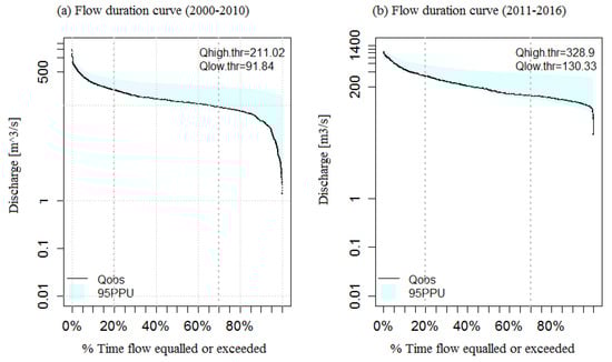 Flow Duration Curve of Tana River, comparing period 2000–2010 and period 2011–2016 showing observed streamflows (Qobs) for two uncertainty bounds (95PPU being upper bound at 95% confidence level).