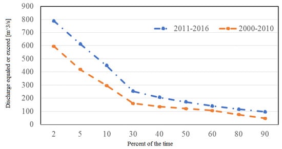 Flow characteristics for the Garissa gauging station showing discharge equaled or exceeded and the proportion of the time (%) for the periods 2000–2010 and 2011–2016.