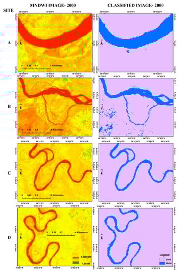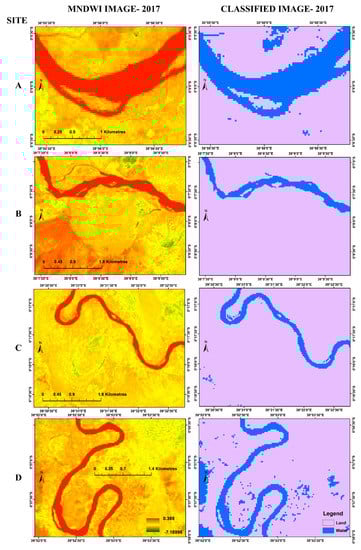 River channel features, such as style, width, cut-offs and shifting were identified using geospatial techniques during the study period (2000 to 2017) for four sites A, B, C and D (Figure 1) as shown in Figure 8 and Figure 9. The location of these reaches was selected based on visual analysis of temporal satellite images and large morphological alterations in the river, particularly where big changes in the river bank could be observed within the study reach. From Figure 8, site A portrays a plan-view feature of a single channel river at this stretch in 2000, but by 2017 (Figure 9) some form of braiding can be observed. The MNDWI and classified 2000 images at sites B and C show an anabranching river form which seems to have disappeared in 2017 (Figure 9). The floodplain of the meandering river shows a truncated meander scar, a wholly filled abandoned channel or oxbow lake recording at site C (see MNDWI image in Figure 9), meaning that the river abandoned the two-channel character it had in 2000 to perform a cutoff in 2017. The largest morphological changes have been found for sites B and C over the 17-year period. The images at site D show meandering sinous style in 2000 which seem to have been maintained in 2017 with some form of braiding.
