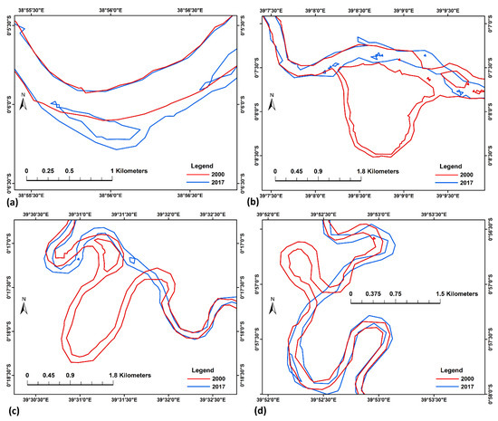 Spatio-temporal river channel dynamics map of Tana River at the study reach based on image analysis from 2000 to 2017. (a–d) refer to sites A, B, C, and D respectively in Figure 8.