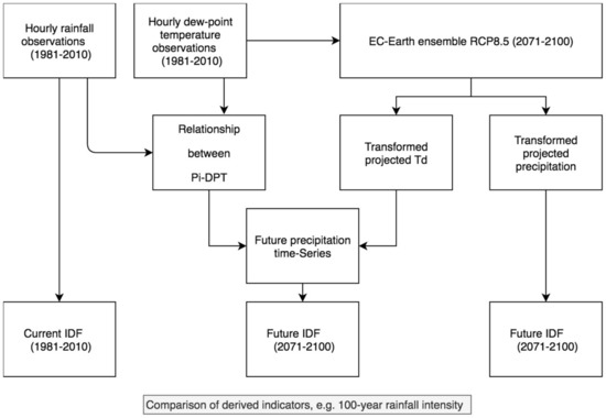 To manage flood risk in urban areas, it is important to design cities and their drainage systems in such a way that they can deal with extreme rainfall events and subsequent peak surface flows. Given their high investment costs, drainage systems are designed for multiple decades and thus their design must be evaluated against any foreseeable changes in their performance. To estimate the required discharge capacity associated with precipitation extremes, Intensity-Duration-Frequency (IDF) curves are often used, based on observed rainfall extremes as well as future scenarios. Several approaches employ the results from climate models, as well as weather generators to project future changes in such IDFs [1,2,3]. With anthropogenic climate change, daily and shorter-duration rainfall amounts are expected to increase [4], posing additional challenges for resilient planning in expanding urban agglomerations. While daily rainfall amounts are expected to increase with about 7% per 1 °C warming, there is evidence that observed short-duration rainfall extremes will increase more rapidly in intensity (e.g., [5,6]). Estimates from climate modelling of future sub-daily rainfall extremes also show a higher increase [7,8,9,10].