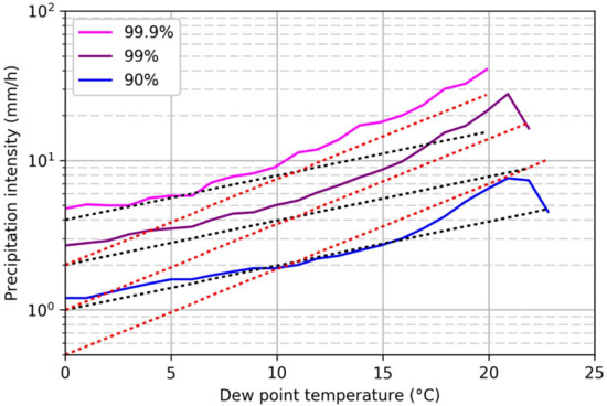 For the second approach, a relationship is determined between rainfall intensity and dew-point temperatures at hourly intervals. Lenderink et al. [17] found the best relationship between precipitation intensity and dew-point temperature when the Td values 4 h before the observed precipitation are considered. The best relationship here is defined as the most constant dependency across the largest range of dew-point temperatures. After testing several lead times of Td, we confirmed this four-h lead, which is implemented for the rest of the analysis.