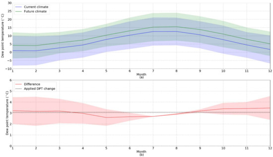 We computed the projected change in dew-point temperature as simulated by the EC-Earth climate model by subtracting the mean Td of the control period (1981–2010) from the mean of the future Td for the period 2071–2100. Figure 3a shows the monthly mean Td values for both current and future climate. Under RCP8.5 the monthly mean Td increases from 2.59 °C in the month of May to 3.46 °C in December, see Figure 3b. It shows a particularly narrow confidence interval for July and August. This could be related to the relatively low air humidity in these months over the Netherlands and thus relatively small variation in dew-point temperature.