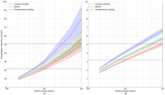 Figure 4a shows the IDFs for a 1-h duration rainfall event for the current climate, as well as a projection for the future climate for RCP 8.5, using the ADCM and dew-point temperature scaling approaches. Figure 4b shows the resulting IDFs for a 24-h duration rainfall event. When focusing on events with a 10-year return period and a 100-year return period we find clear shifts in precipitation intensities.