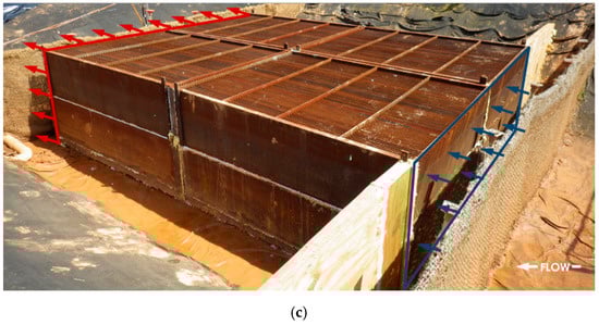 The first lamella configuration was applied in the upward flow condition. Figure 1a shows an aerial view of the lamella settler installed in the third bay of the basin during an experiment. Eight individual units were fabricated using galvanized steel tubing and plates, and installed to create a system of four tanks stacked two rows in height (Figure 1). Wing walls were constructed out of lumber and installed in the upstream face to force water through the opening at the bottom of the lamella system, as indicated by blue arrows in Figure 1b. Flow was directed up the plates and out the sides of the tanks along the openings, as shown by red arrows in Figure 1b.