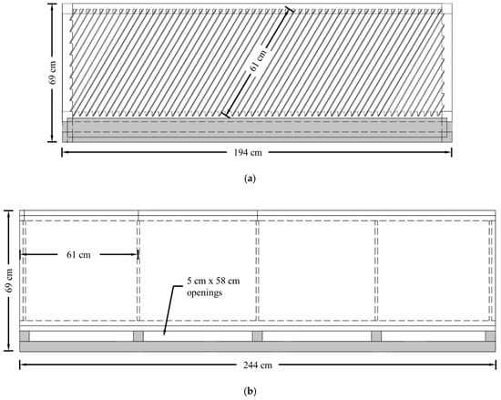 The second lamella configuration was performed in the parallel flow condition. The eight units were removed from the basin, cleaned, and reinstalled at a 90-degree rotation to allow flow to travel in the cross-current direction, as shown in Figure 1c. For both orientations, wing walls were fabricated and gaps between settlers were sealed using strips of sheet metal, silicone caulk, and expanding insulating foam to prevent short-circuiting. Schematic cross-section and profile views of A-A and B-B planes in Figure 1 for the lamella settler units constructed and used in this study are given in Figure 2a,b to provide basic geometry information.