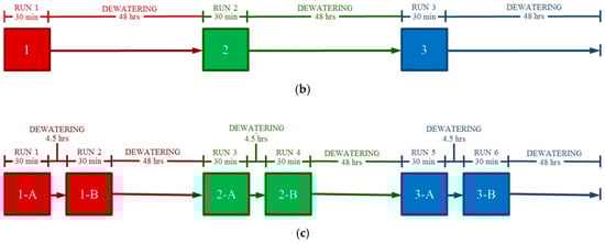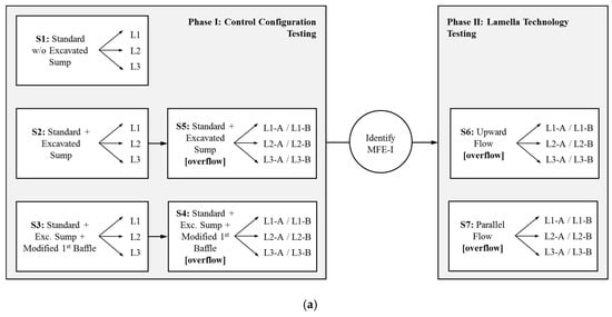 (a) Sediment basin testing regime—27 total tests, (b) empty condition test sequence, and (c) overflow condition test series sequence.