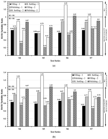Turbidity reduction ratios (a) Bay 2/Bay1, and (b) Bay 4/Bay 1. Note: S1: standard w/o sump, S2: standard w/sump, S3: mod. 1st baffle, S4: mod. 1st baffle (overflow), S5: standard w/sump (overflow), S6: lamella upward (overflow), S7: lamella parallel (overflow).