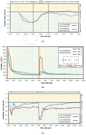 Turbidity results comparison between bays for modified baffle treatment; (a) B2/B1 turbidity ratio comparison of S2 and S3 treatments, (b) modified first baffle, S4, turbidity, and (c) B2/B1 turbidity ratio comparison of S4 and S5 treatments.