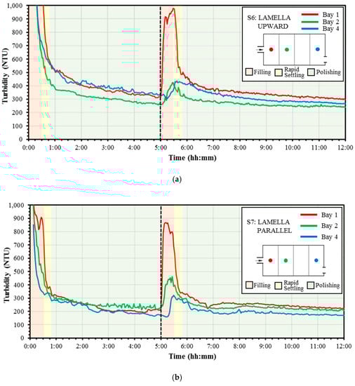 The ratio between Bay 2 and Bay 1 turbidity was compared in Figure 6c for the two configurations, each normalized by dividing by Bay 1 turbidity. Results from the comparison show that the standard first baffle configuration (S5) outperformed the modified first baffle configuration (S4), further validating results from the single fill experiments, S2 and S3. During the filling period (i.e., 00:00 to 00:30 and 5:00 to 5:30) and the polishing periods (i.e., 00:50 to 5:00 and 5:50 to 12:00), the average performance difference between the configurations show that the standard first baffle is 26.5% and 19.5% more effective at reducing turbidity between Bay 1 and Bay 2, respectively. The multiple linear regression analysis (Table 3) indicates tests conducted with the basin partially full (i.e., overflow experiments conducted in S4 through S7) resulted in an improvement in turbidity ratios (i.e., Bay 4/Bay 1 and Bay 2/Bay 1) across the filling, rapid settling, and polishing periods. In addition, an analysis of variance (ANOVA) indicated all experiments conducted with the basin partially full provided increased reduction in turbidity across the basin (i.e., Bay 4/Bay 1 ratio) at a 90% confidence level. These results corroborate past research studies [,] that identified diminishing returns with decreased baffle POA.