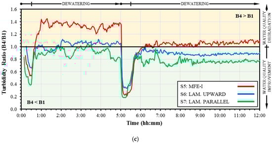 (a) Turbidity results for lamella settlers in upward flow configuration, S6, (b) turbidity results for lamella settlers in parallel flow configuration, S7, and (c) B4/B1 turbidity ratio comparison of S5, S6, and S7 treatments.
