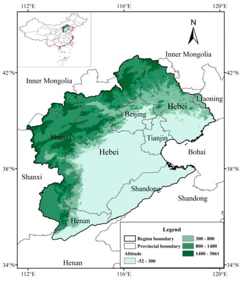 The HRB is located between 112–120° E longitude and 35–43° N latitude, with the Bohai Sea to the east, the Yellow River to the south, the Yunzhong and Taiyue Mountains to the west, and the Inner Mongolia Plateau to the north. The total area of the HRB is 320,600 km2, accounting for 3.3% of the total area of the country. The HRB spans eight provinces: Beijing, Tianjin, Hebei, Shanxi, Shandong, Henan, Inner Mongolia, and Liaoning. It is a political and cultural center and an economically developed region of strategic significance in China. The HRB has two major rivers: the Hai River and the Luan River. The Hai River, which is the main water system for the area, consists of the Ji Canal River, Chaobai River, North Canal, Yongding River, Daqing River, Ziya River, and Zhangwei River, as well as plains rivers, such as the Tuhai River and Majia River, each of which enters the sea individually. The Luan River includes itself and the rivers along the eastern coast of Hebei Province. The annual average temperature range of the basin is between 1.5 °C and 14 °C, the annual average relative humidity is between 50% and 70%, and the average annual precipitation is 539 mm (semi-arid climate). The annual average land-surface evaporation is 470 mm, and the water surface evaporation is 1100 mm. The geographical location and topographic distribution of the study area are shown in Figure 1.