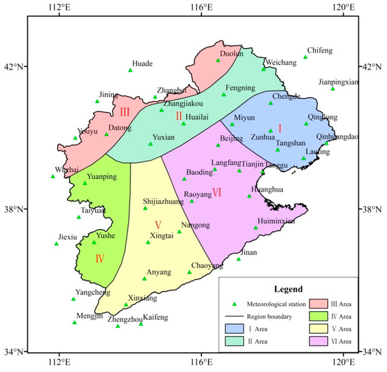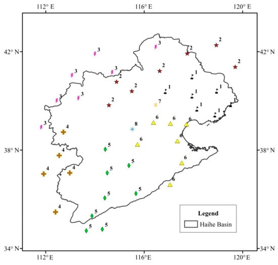 MATLAB software (MATLAB 9.0, R2016a, MathWorks, Natick, MA, USA) was used to train the algorithm. The clustering results of the stations and their spatial distribution are presented in Figure 2. According to the clustering results, the HRB could be divided into six sub-regions (Figure 3). Detailed information for each sub-region is shown in Table 1.