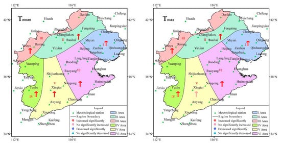 As shown in Figure 4, the interannual average temperatures (Tmean) in sub-regions I to VI presented a significant upward trend. With the exception of sub-region V, the average maximum temperatures (Tmax) of all sub-regions also increased significantly. The significance level of the trend of the average minimum temperatures (Tmin) was consistent with that of the Tmean. The Tmean in spring and winter in sub-regions I to VI increased significantly; in summer, it increased significantly only in sub-regions II and III. In fall, it increased significantly in the majority of sub-regions (except for sub-region I). Only the significance levels for Tmax in winter of sub-regions I to VI were consistent with those of Tmax. The Tmin of sub-regions I to VI in all four seasons significantly increased. However, it can be seen from Table 2 that the Tmin rose more rapidly, followed by the Tmean, with the Tmax rising the most slowly.