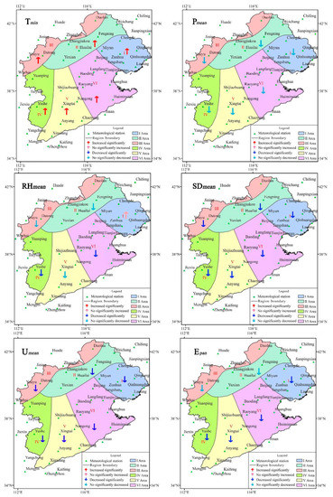 For TFPW-MK test detrending, the TSA method is used to calculate the magnitude of the trend of the meteorological variables. The rates of the meteorological elements of each sub-region for 1961 to 2010 are shown in Table 4.