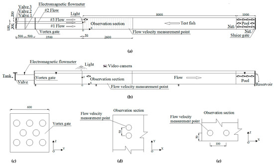 Schematic plan of the general arrangement of the model (Unit: mm). (a) Top view; (b) Front view; (c) Vortex gate; (d) X–Y coordinate system; and (e) Z–X coordinate system.