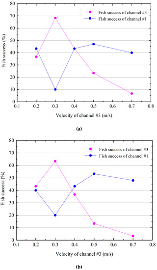 The results in the two cases showed that when the flow velocity of flow channel #1 was constant, the percentage of successful migration of the test fish in flow channel #3 first increased, and then decreased as we increased the flow velocity of flow channel #3, as shown in Figure 2. When the flow velocity of flow channel #3 was 0.2 m/s, the percentages of successful migration of the test fish in flow channel #1 and flow channel #3 were almost the same, and the upstream migration of the test fish had a certain randomness; when the flow velocity of flow channel #3 was 0.3 m/s, the highest percentage of successful migration was observed. When the flow velocity of the flow channel #3 was 0.3 m/s, and the flow velocities of flow channel #1 were set to 0.1 m/s and 0.2 m/s, the percentages of successful migration of the test fish were 68% and 63%, respectively. These were higher than the percentages obtained when the flow velocities of flow channel #3 were 0.2 m/s and 0.4 m/s, by 20%–32% and 25%–27%, respectively. When the flow velocity of flow channel #3 was greater than 0.3 m/s, the percentage of successful migration of the test fish in flow channel #3 decreased, gradually, with increasing flow velocity. When the flow velocity of flow channel #3 was 0.7 m/s, the percentage of successful migration of the test fish was only 3%–7%. In this situation, the flow velocity of flow channel #3 was close to the critical swimming speed of the test fish, and most of the test fish could not migrate in flow channel #3; some fish were forced downstream, and some entered flow channel #1.