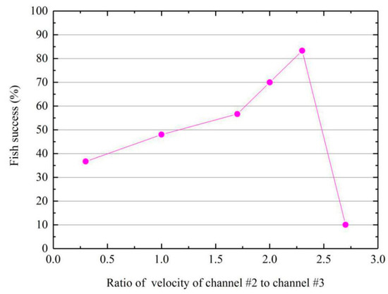 The ratios between the flow velocities at the entrance of the fish-luring channel and at the fish collection system entrance were obtained. The relationship between the percentage of successful migration in flow channel #3 and the ratio of the flow velocity is shown in Figure 3. The percentage of successful migration of the test fish in flow channel #3 increased gradually; as the ratio of the flow velocity increased, the percentage of successful migration of the test fish in flow channel #3 increased, gradually. When the ratio was increased to 2.3:1, the highest fish-luring efficiency of the flow at the fish collection system entrance was obtained with a percentage of successful migration of 84%, which was about 1.2 times that obtained without the fish-luring channel. When the ratio was further increased to 2.7:1, the flow velocity at the entrance of the fish-luring channel was close to the critical swimming speed of the test fish. The fish-luring flow formed a strong jet, mixed with the water flow of flow channels #1 and #3, downstream of the exit of the channel, forming a water flow barrier before the entrance of flow channel #3. The percentage of successful migration of the test fish in flow channel #3 decreased to, approximately, 10%, which was 74% lower than that obtained when the ratio was 2.3:1. It could be seen that a suitable fish-luring flow helped to increase the attractiveness of the fish collection system entrance to the fish, and there existed an optimal ratio between the flow velocities at the entrance of the fish-luring channel and at the fish collection system entrance; this ratio was 2.3:1 for the test fish in this study.