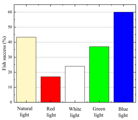 Figure 4 shows the percentages of successful migration of the test fish, under different light colors. Under natural light conditions, the percentage of successful migration of the test fish in flow channel #3 was approximately 42%. A very large decrease was observed for the percentage of successful migration of the test fish in flow channel #3, under the red light (17%). When the white light was used, the percentage of successful migration of the test fish in flow channel #3 was approximately 24%. Under the green light, the percentage of successful migration of the test fish in flow channel #3 was approximately 37%. When the blue light was used, the percentage of successful migration of the test fish in flow channel #3 was significantly increased to 60%, which was about 1.5 times that obtained under natural light. This indicated that blue light was a good option for attracting the test fish.