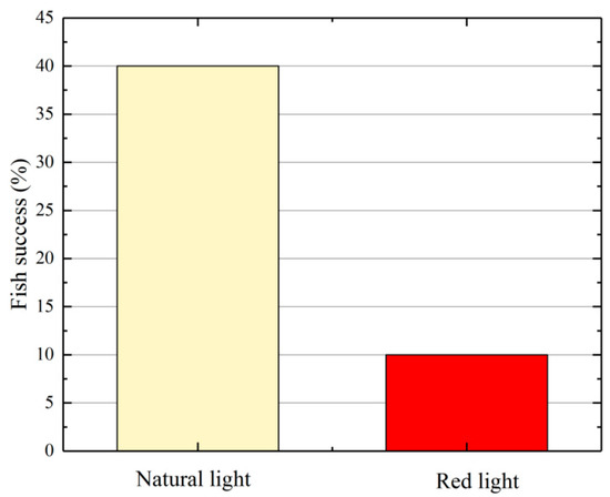 In order to further verify the avoidance behavior of the test fish under red light, the red light source was placed at the entrance of flow channel #1, and the entrance of flow channel #3 was illuminated with natural light. The upstream swimming behaviors of the test fish were recorded, and the percentage of successful migration was calculated. The results are shown in Figure 6. When the red light was placed at the entrance of flow channel #1, the percentage of successful migration of the test fish in flow channel #1 was reduced from the 40%, seen under natural light conditions, to 10%.