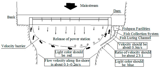 A flow velocity barrier is formed when the flow velocity of the mainstream channel is too large. When this happens, fish generally choose to complete their upstream migration along the shore [35], as shown in Figure 7. The range of the flow velocity, along the shore of the mainstream channel was about 0.1–0.2 m/s. Therefore, the flow velocity at the fish collection system entrance must be higher than that along the shore of the mainstream channel, in order to attract fish into the fish collection system, thereby, improving the fishpass efficiency of the fishpass facilities. Therefore, the test was divided into two cases.