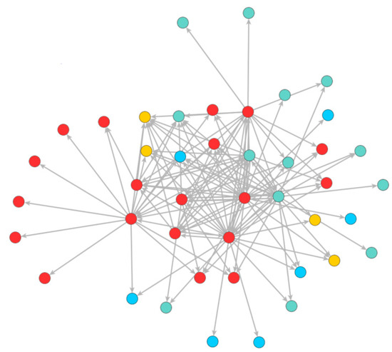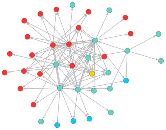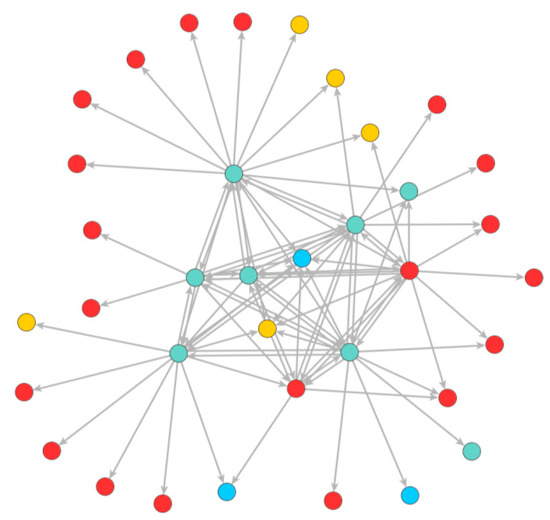 Like the other two cases, the interview partners mainly named local actors (red nodes) as important for water provision (50%; Table 4, Case 3) in Case 3. However, there is a separation into a divided core–periphery structure (see Figure 3): one consisting of municipal actors (red nodes) and the other of mainly regional actors (turquoise nodes). Municipal actors in the periphery only link to municipal actors in the core, and regional actors in the periphery only link to regional actors in the core. Furthermore, regional actors also build a cluster internally linked to each other. Here we find that regional and local actors do not seem to perceive each other as important for water provision. The in-degree centrality is between that of Case 1 and 3 (average in-degree centrality of 3.14, Table 4, Case 3; see also Table A3 in Appendix A). In addition, and in contrast to the other two cases, the national actors (blue nodes) are most clearly at the periphery. Private actors (orange node) have the least importance in this case.